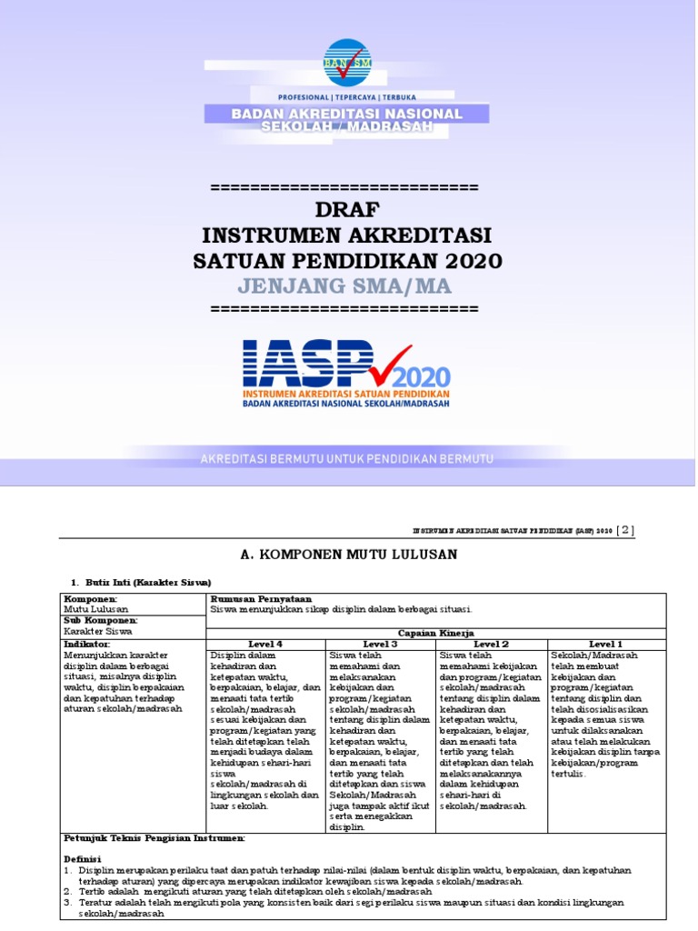 Mutu lulusan rumusan pernyataan siswa menunjukkan sikap disiplin dalam berbagai situasi. Jan 10, 2020 · draf instrumen akreditasi satuan pendidikan iasp 2020 jenjang smp/mts, download disini. Nov 27, 2020 · draft iasp jenjang sma/ma tahun 2020 ini selanjutnya dapat menjadi acuan dalam penilaian kelayakan program atau satuan pendidikan pada jalur formal. Feb 01, 2020 · draf iasp tahun 2020 tingkat sma/ma draf iasp tahun 2020 tingkat smk demikian yang bisa kami sampaikan mengenai draf instrumen akreditasi satuan pendidikan (iasp) tahun 2020. Instrumen akreditasi satuan pendidikan (iasp) 2020 0 ===== draf instrumen akreditasi satuan pendidikan 2020 jenjang sd/mi ===== instrumen akreditasi satuan pendidikan (iasp) 2020 1 a.